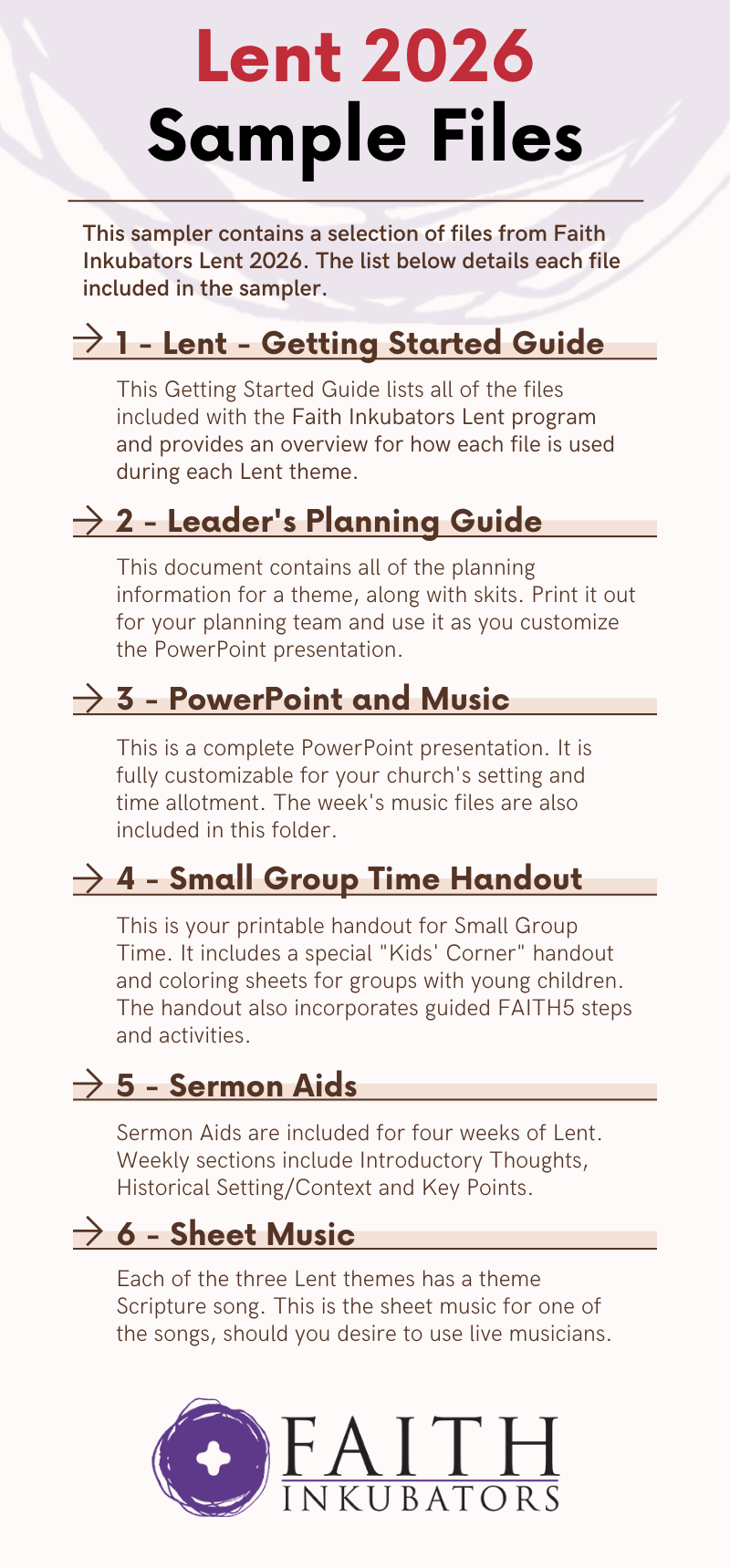 This sampler features the complete Lent 2026 Theme One (Weeks 1 & 2) including handouts and customizable PowerPoint presentations.